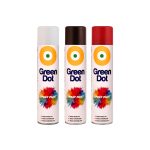 اسپری رنگ قرمز ترافیک و سفید مات و قهوه ای شکلاتی گرین دات مدل color3 حجم 250 میلی لیتر مجموعه 3 عددیاسپری های رنگ گرین دات : یک نوع اسپری رنگ بر پایه رزین آلکیدی یا به اصطلاح رنگ روغنی می باشند که از کیفیت قابل قبولی برخوردارند. این اسپری ها پوشش مناسبی روی سطح دارند و به نسبت قیمت می توانند برای شما یک سطح رنگ شده مناسب را به ارمغان بیاورند. حجم اسپری های گرین دات 300 میلی لیتر می باشد.